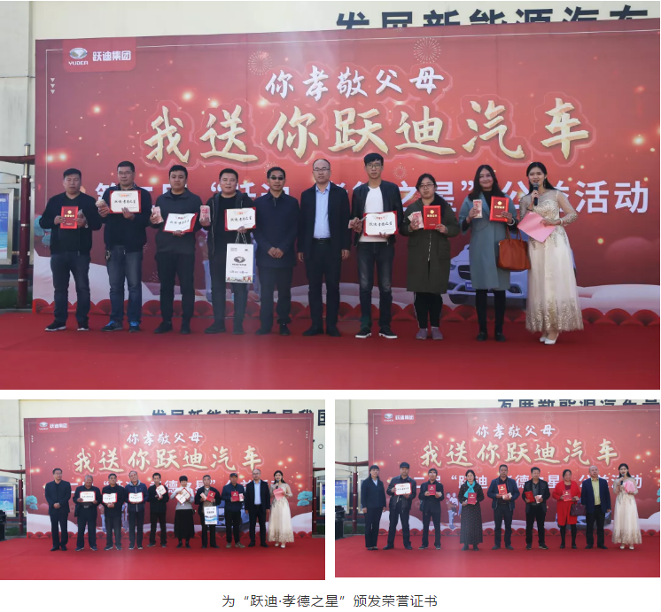 在本次仪式上,评选出第二届首批“跃迪·孝德之星”80人,在签订“跃迪·孝德之星”敬老孝老承诺书后,分别获赠一辆跃迪汽车。